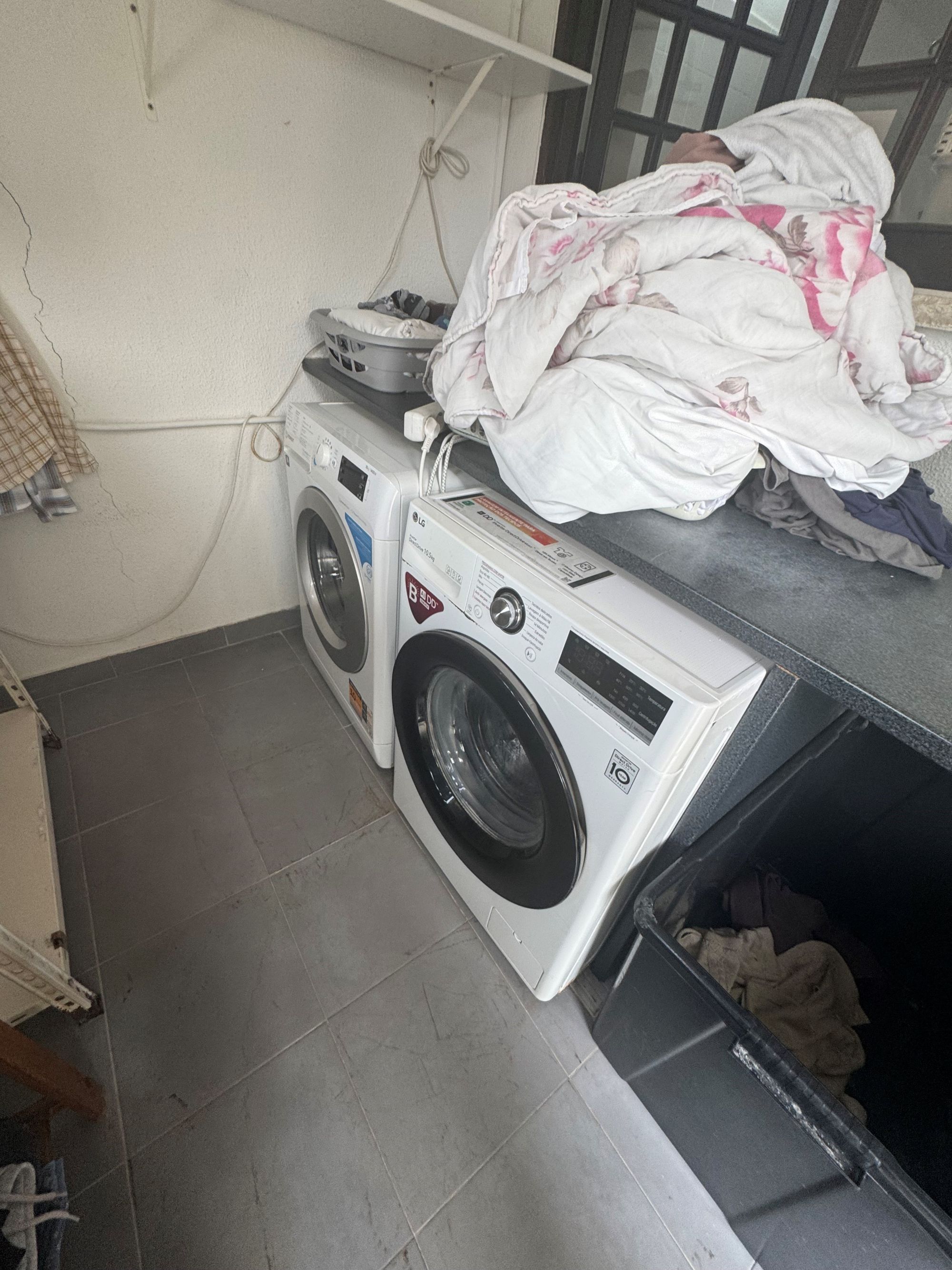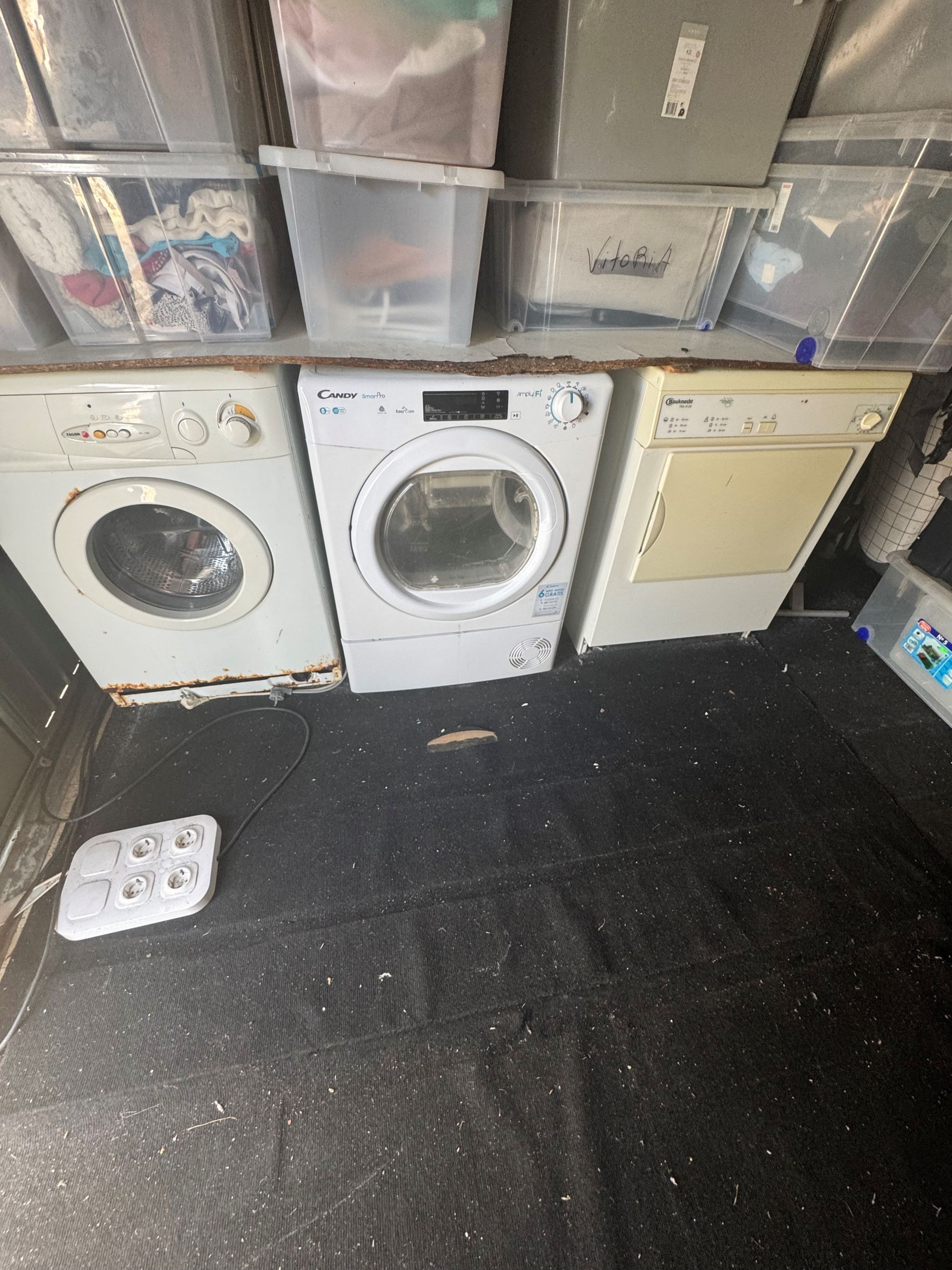 Máquinas de secar roupa ( só uma em funcionamento), caixas de plástico e cadeira de rodas |