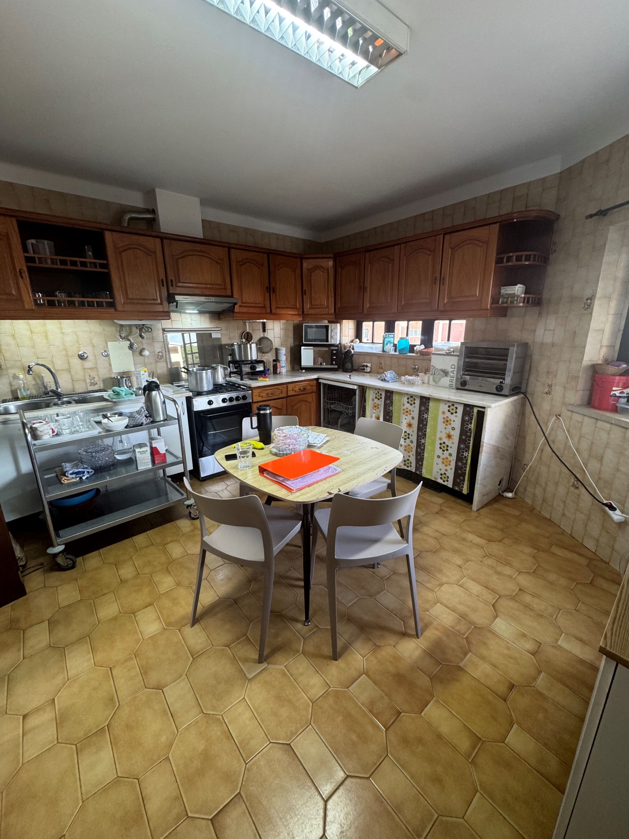 Cozinha composta pelos seguintes bens: Mesa redonda, 4 cadeiras, carrinho de transporte de comida, torradeira, máquina de Café da marca Dulce Gusto, 2 micro-ondas, Trempe, fogão com 4 bicos com forno, Loiças, Tachos, Panela, Talheres, Frigo bar, Arca congeladora, 2 combinados e máquina de lavar louça |