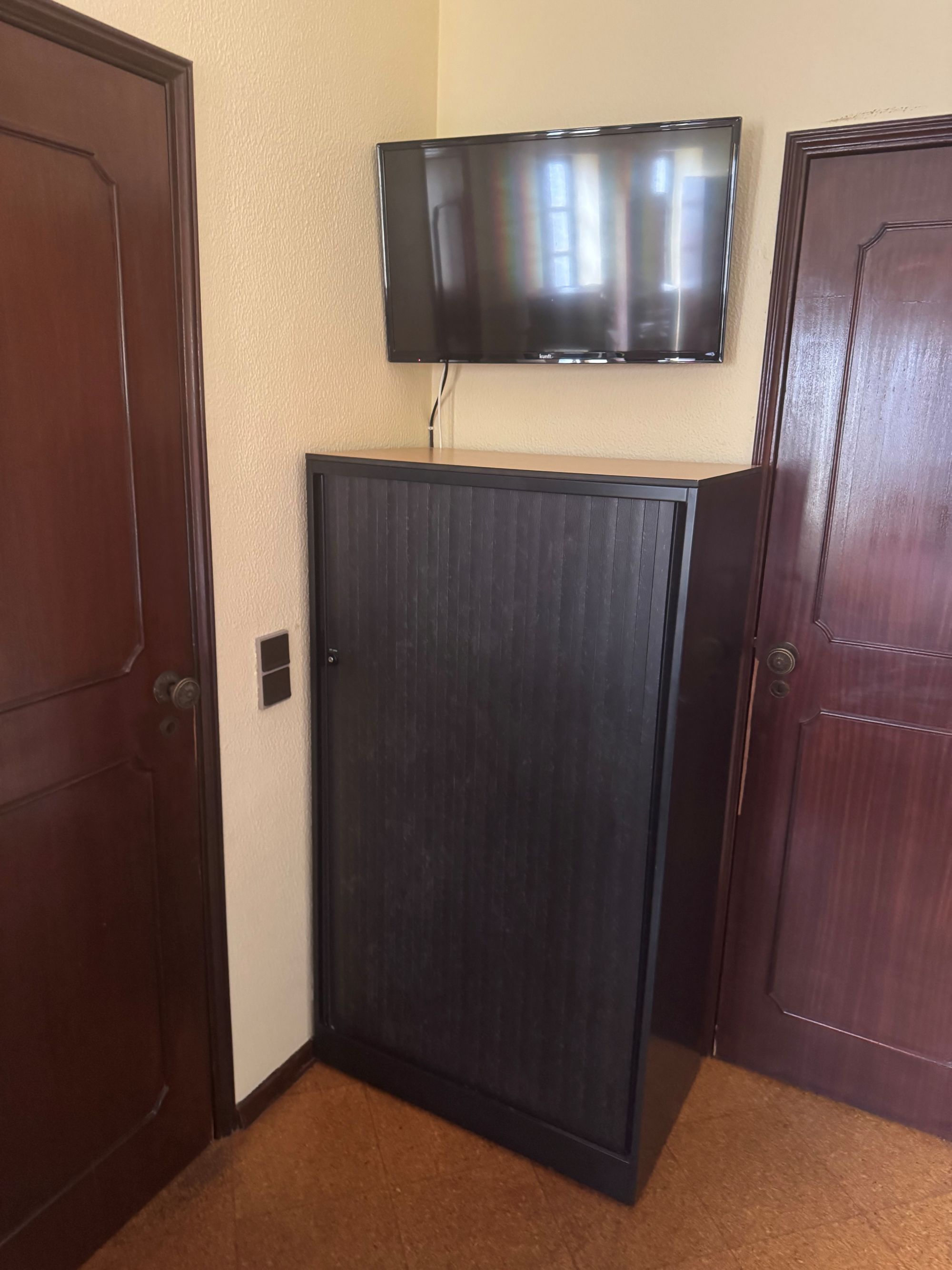 Mesa grande com 8 cadeiras, 16 cadeiras forradas a mala de cor Cinza e Bordéus e 4 televisores |