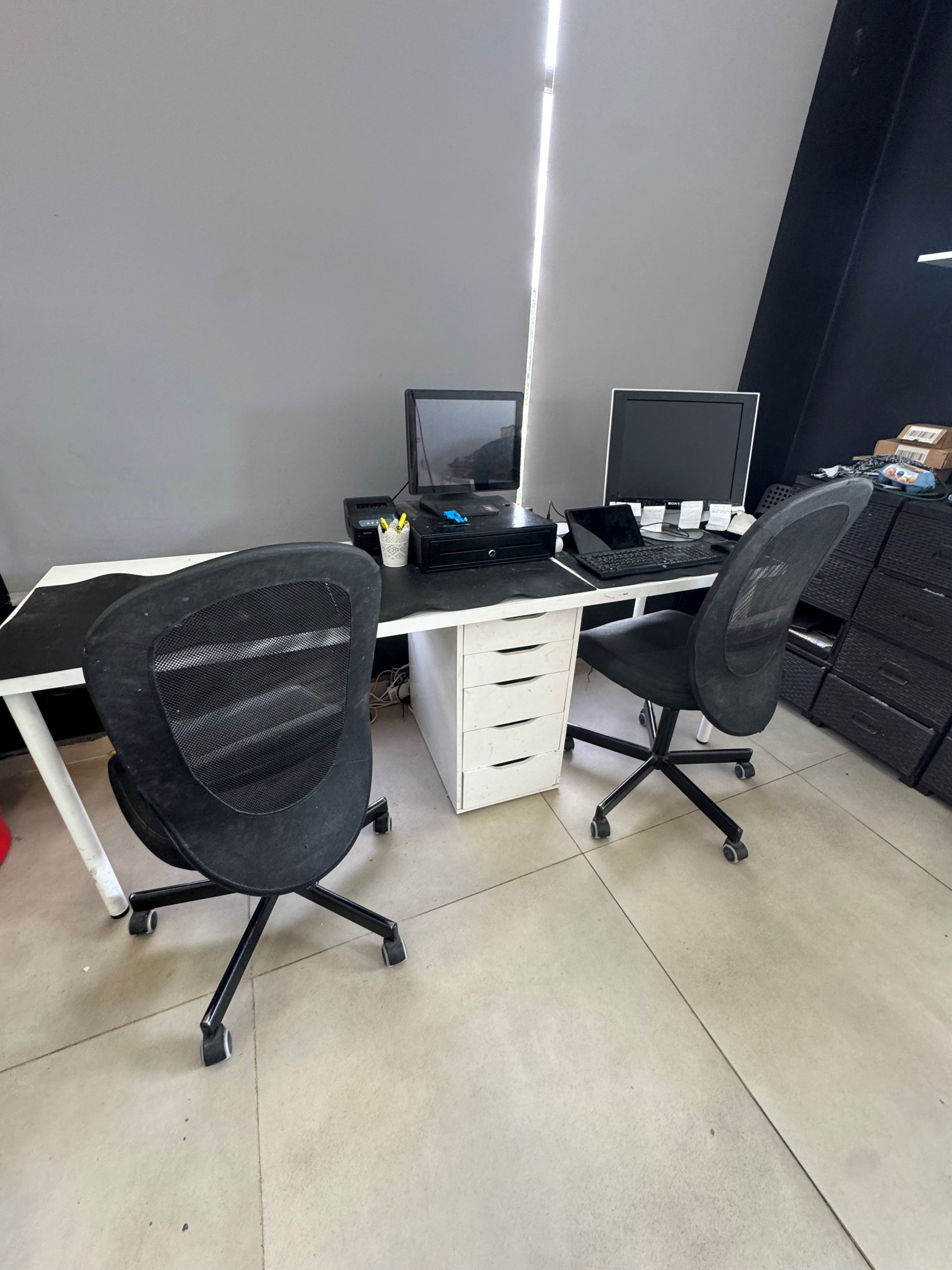 Mesa com bloco de gavetas, 2 cadeiras, impressora de talões, IPAD, teclado, 2 monitores e rato |