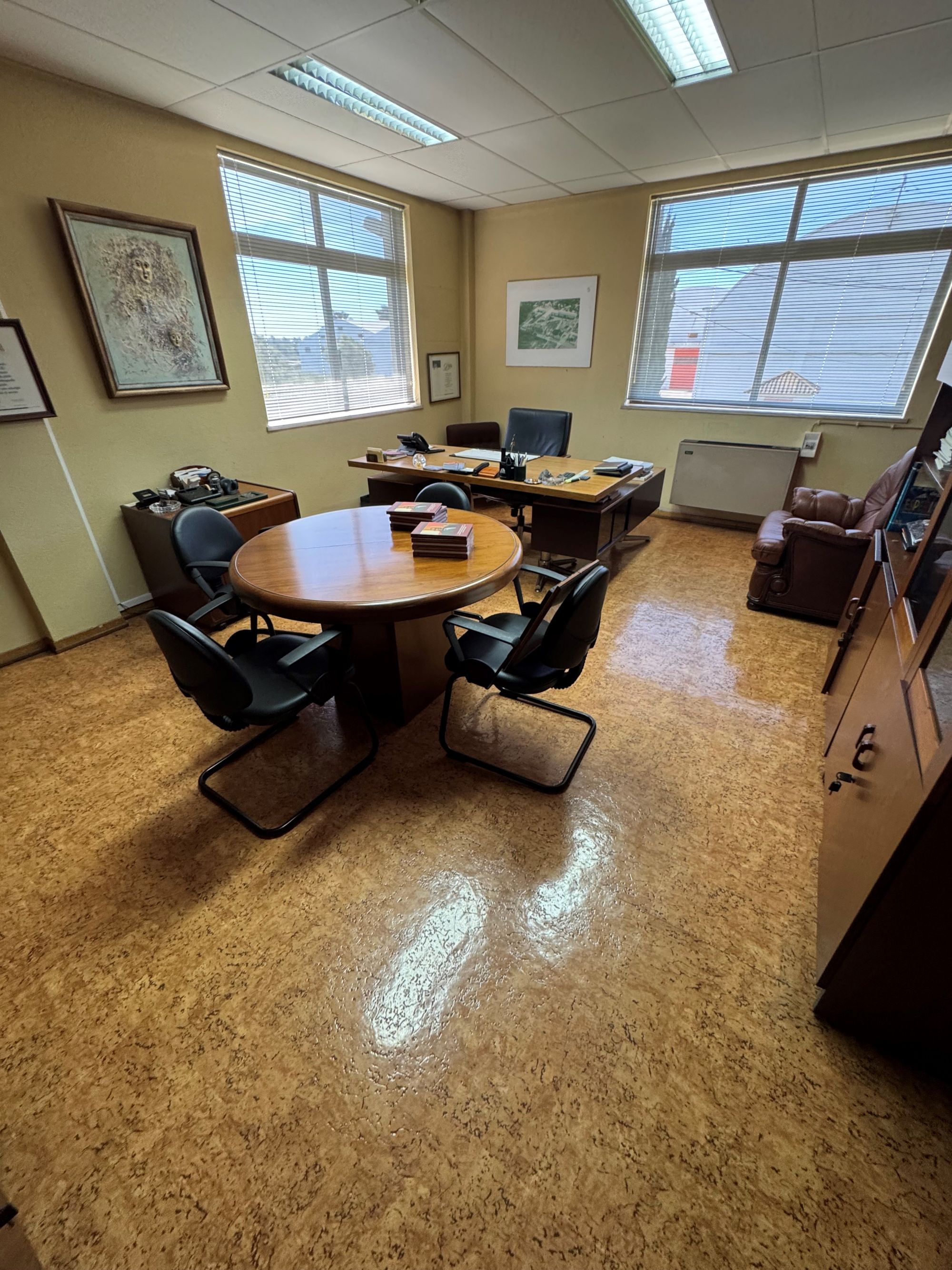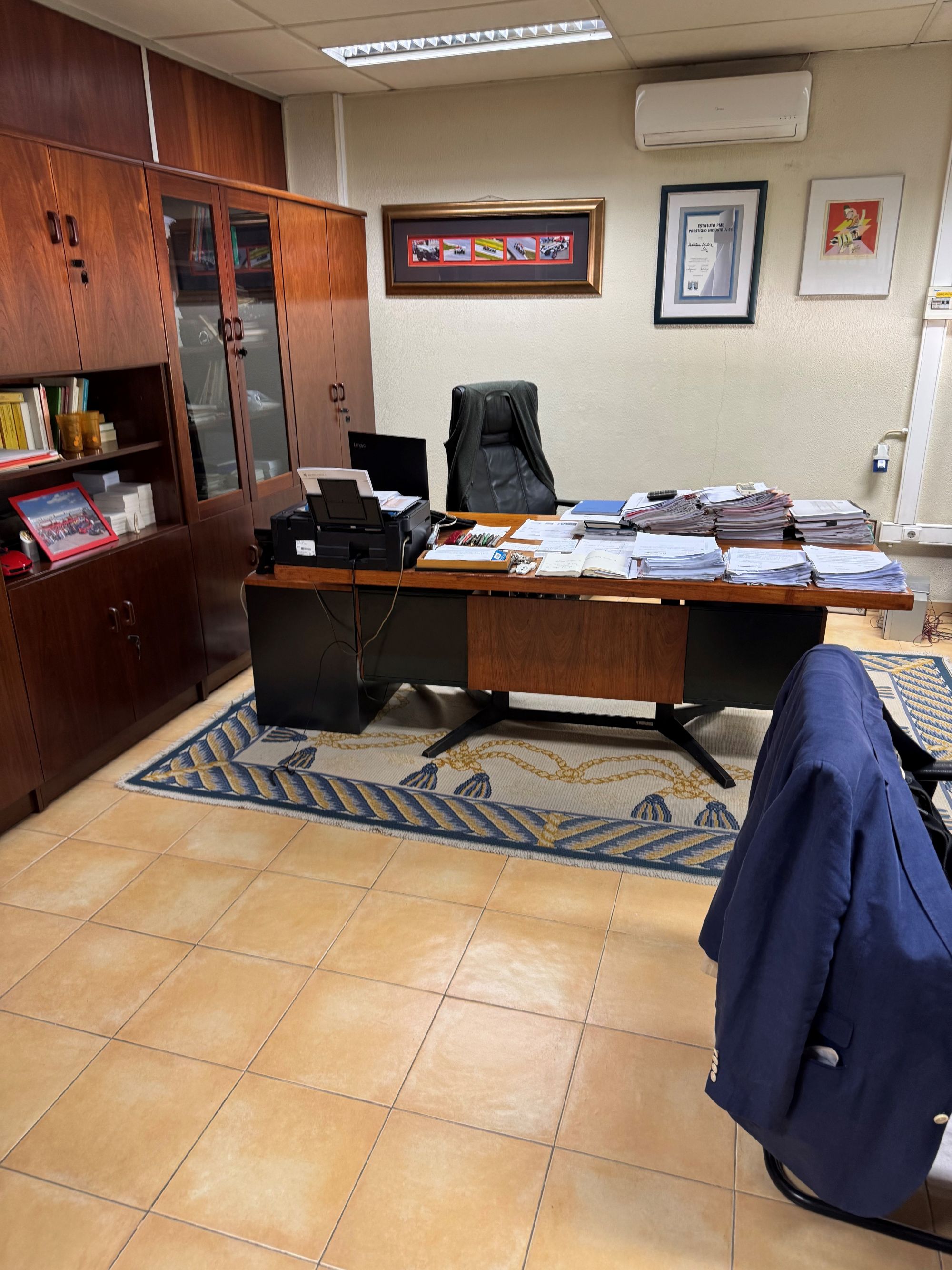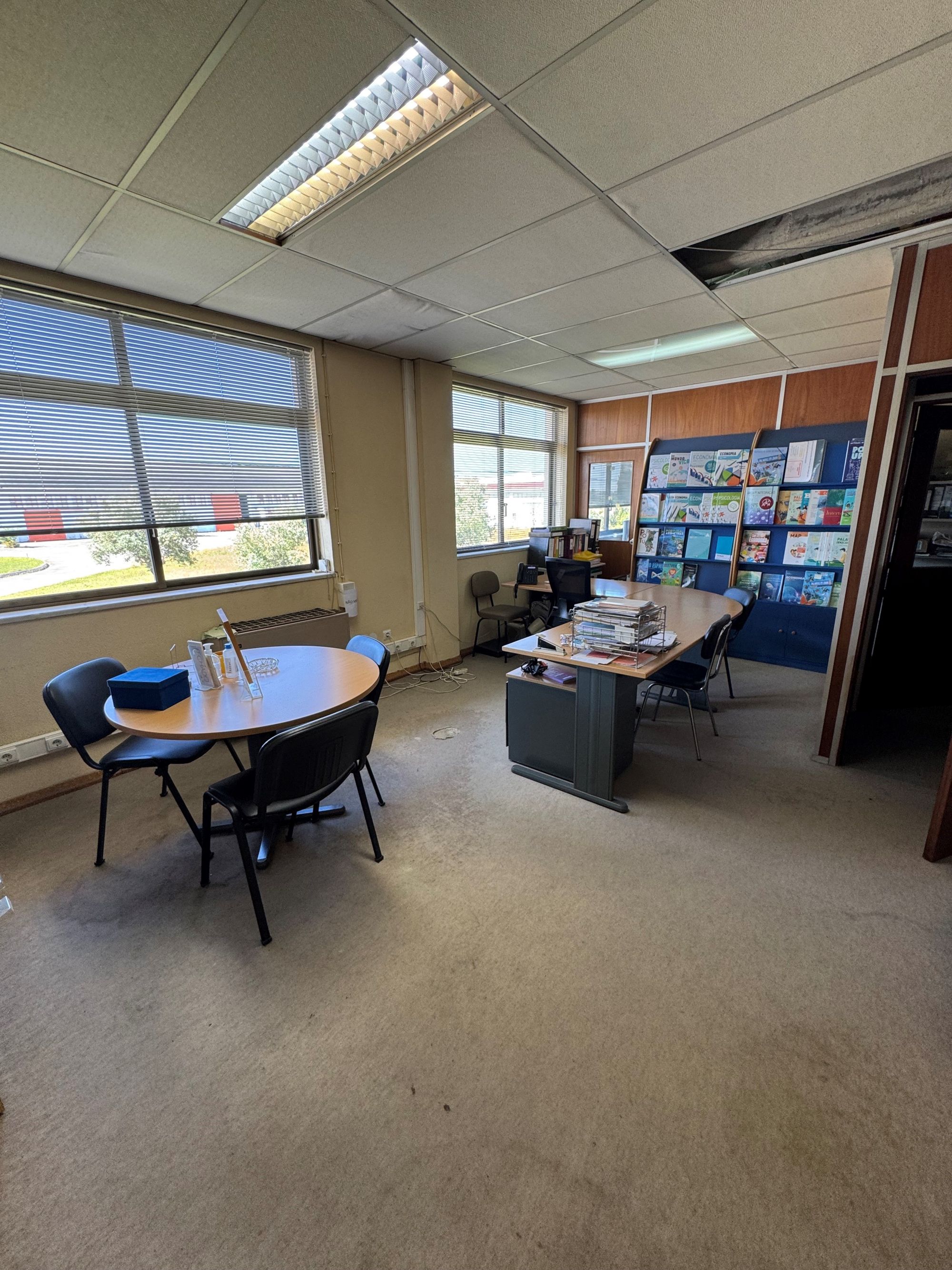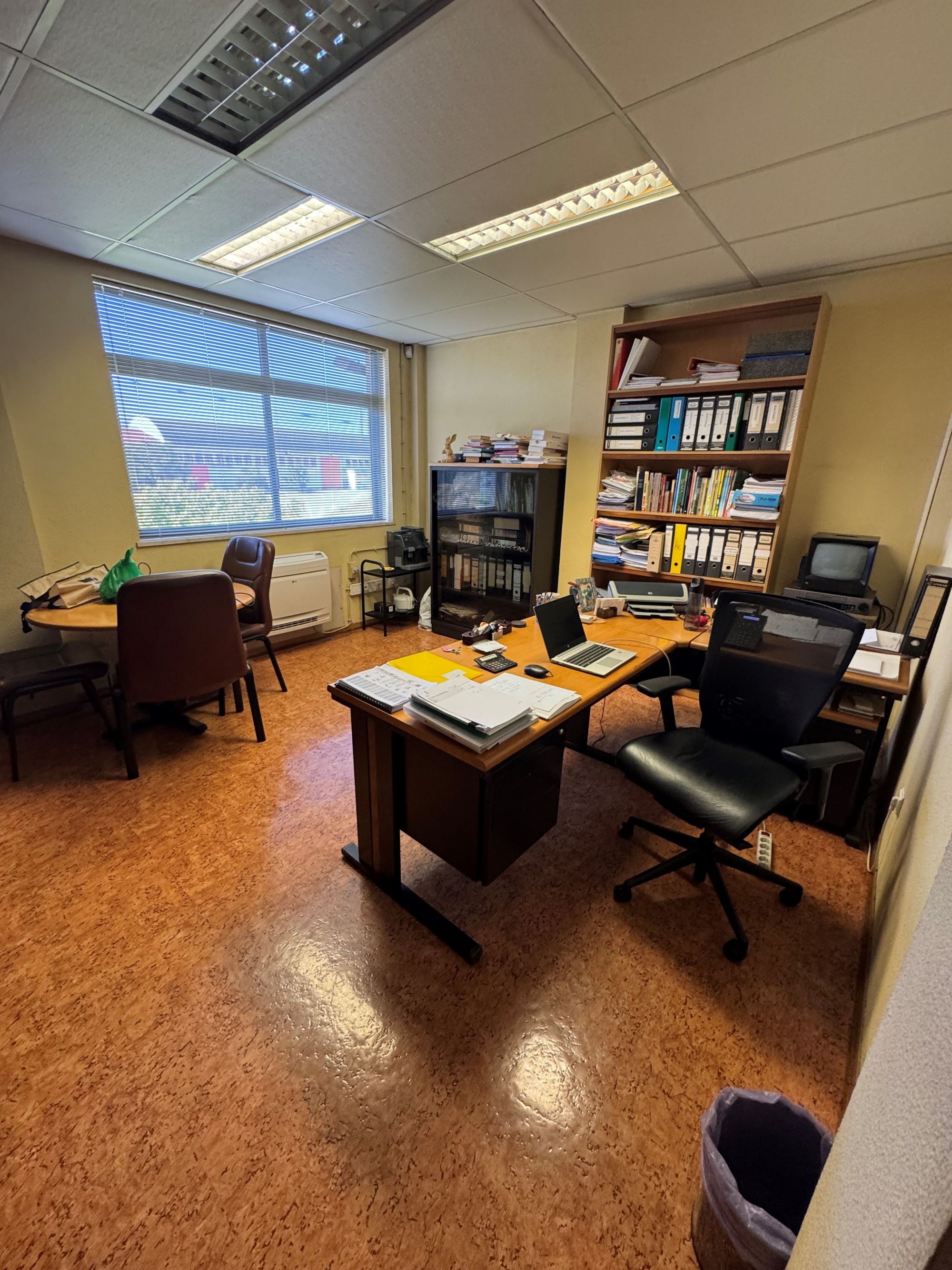 Escritório da administração: mesa redonda com 3 cadeiras, 2 estantes (uma delas de dimensão grande), dois armários e uma secretária com uma cadeira |
