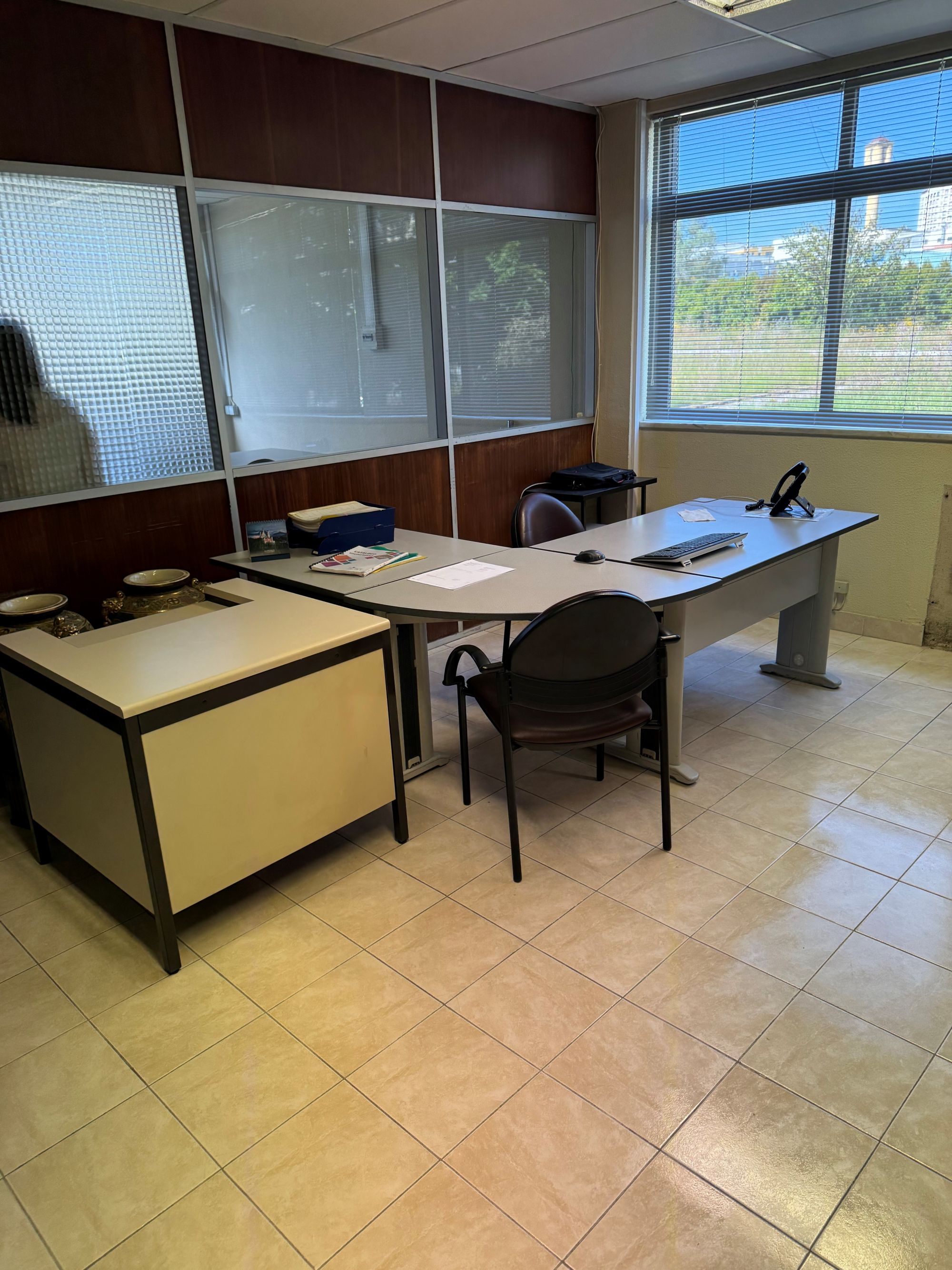 Gabinete da Direção: Secretária em L, Mesa redonda com 3 cadeiras, Cadeirão, 2 armários e Impressora da marca HP |