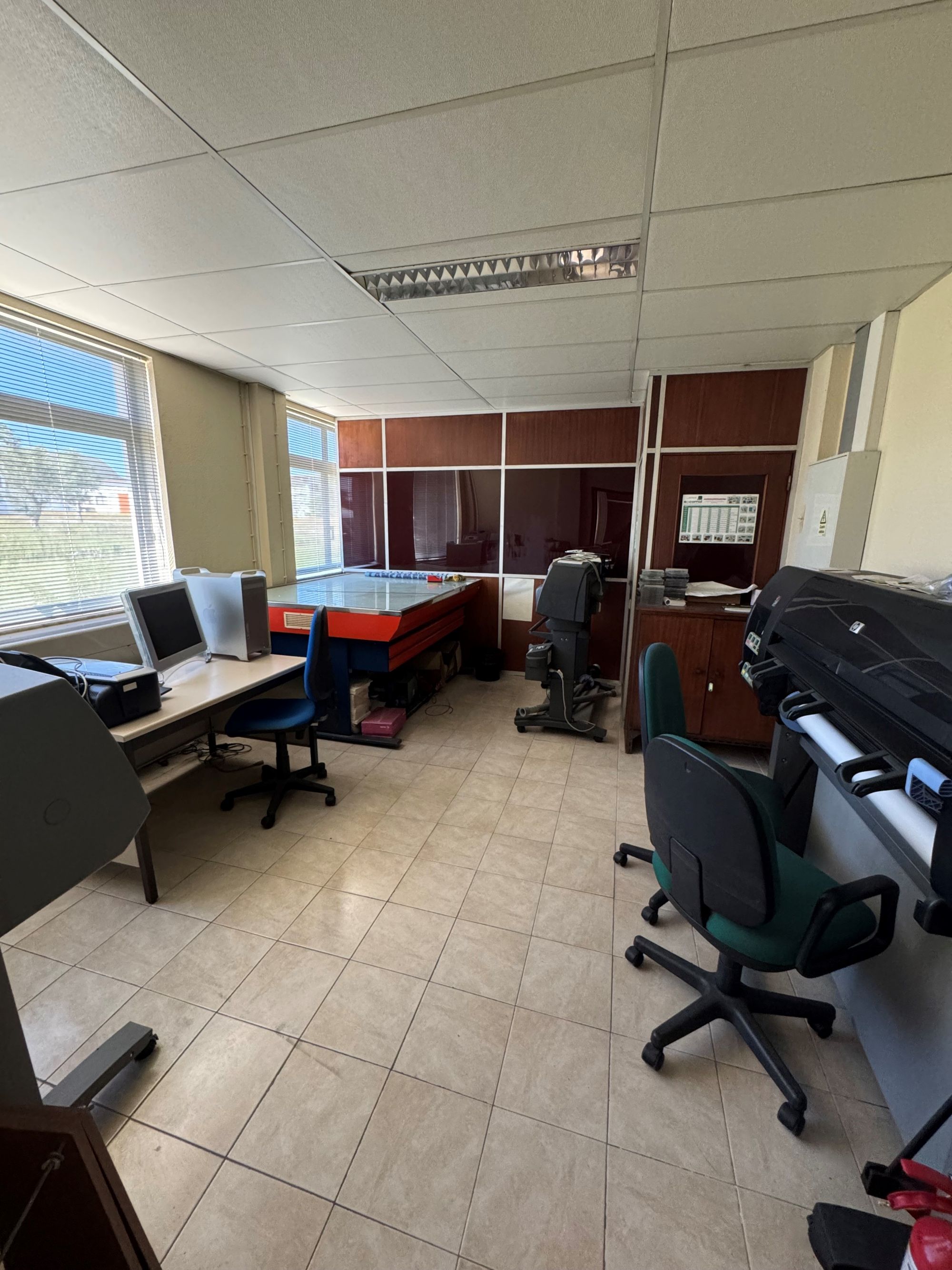 Casa das Ploters : 3 Ploters, Mesa de Luz, Impressora da marca EPSON, monitor da marca MAC, CPU, 3 cadeiras e uma mesa |