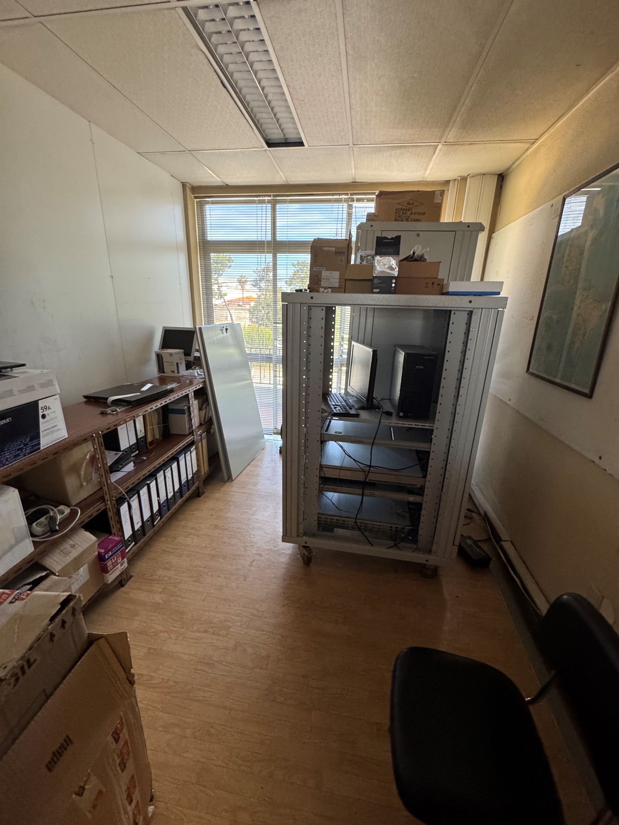 Apoios administrativo: Secretária, 3 ficheiros metálicos com gavetões (constam dados sensíveis), 2 cadeiras, fotocopiadora da marca KEYOCERA e Impressora da marca HP |