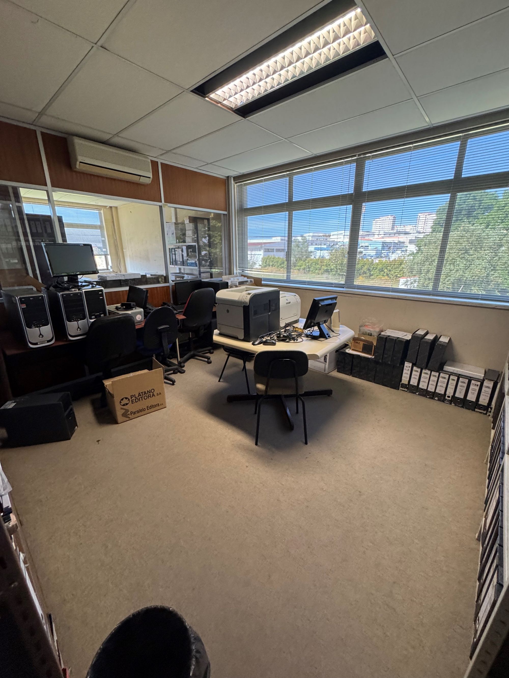 Sala de obsoletos: Material informático, Conjunto de estantes, 2 Secretárias, Mesa redonda e 3 cadeirões |